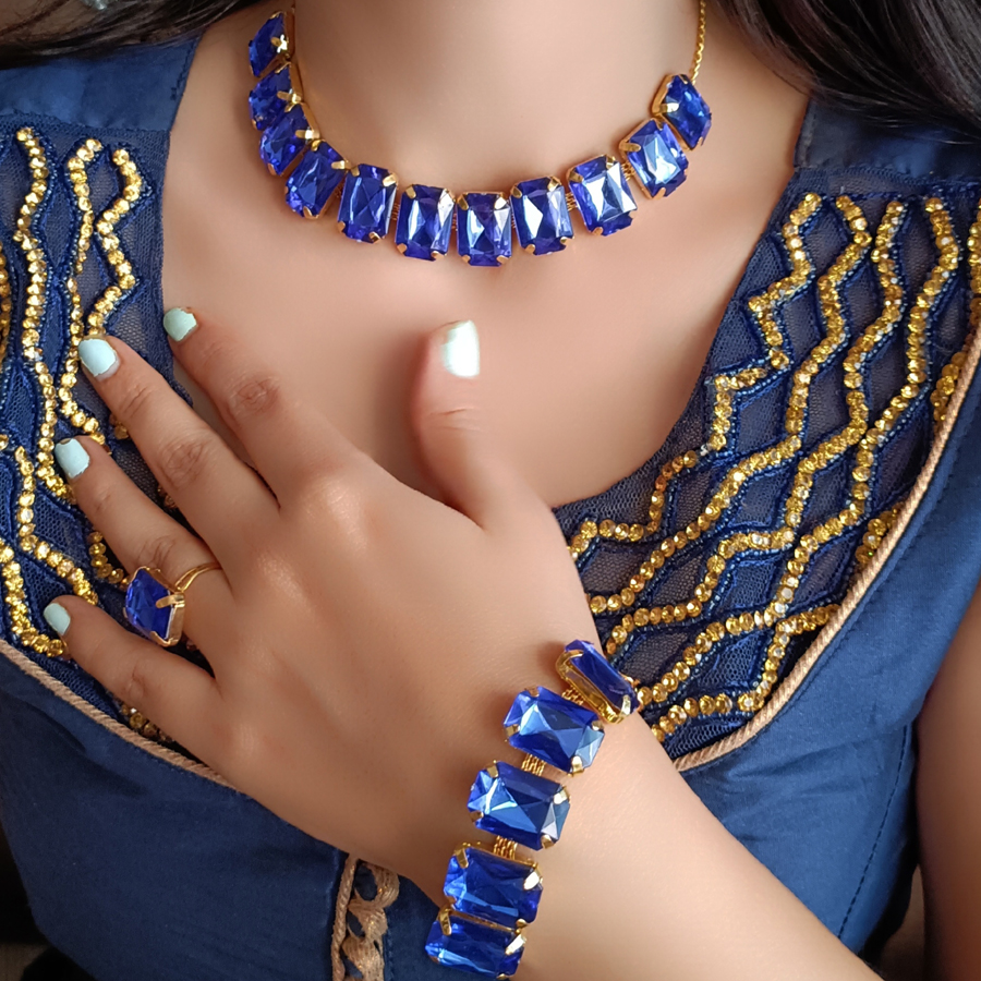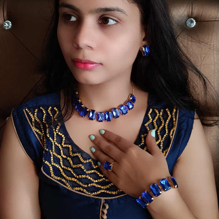 Blue Color Fashionable Crystal Necklace Set. Very Light Weight. With Bracelet, Finger Ring, Earring