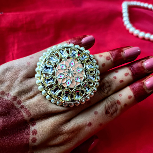 Meenakari Jadau Pearl Adjustable Ring in Peach Color. It is free size and anyone can wear because its adjustable finger ring.